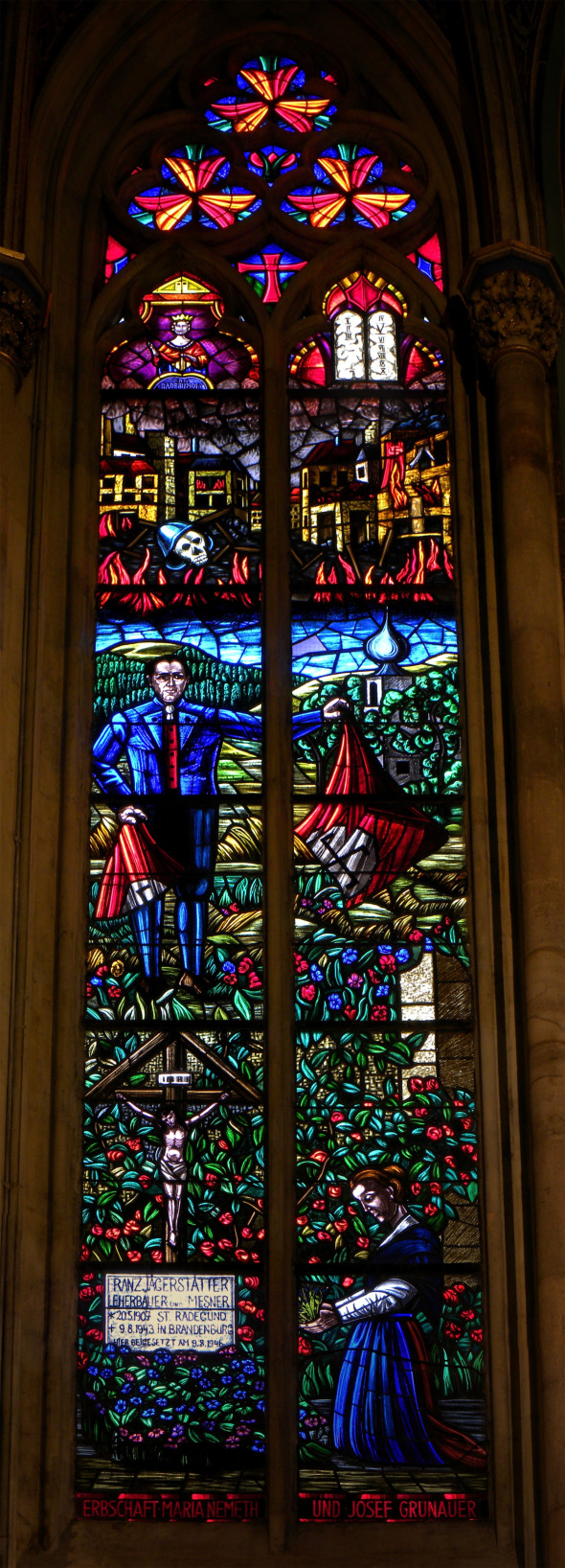 Im Jahr 1972 wurde in der Votivkirche ein Glasfenster eingesetzt, das an den Widerstand gegen den Nationalsozialismus erinnert. Das Fenster zeigt im Mittelfeld Franz Jägerstätter, der eine zerrissene Hakenkreuzfahne in beiden Händen hält.