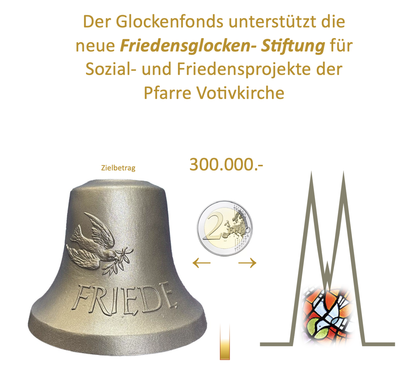 Ihre Spende für die Friedensglocke kommt zugleich sozial bedürftigen Menschen zugute. Die neue Friedensglocken- Stiftung wird auf Dauer zur Förderung von Sozial- und Friedensinitiativen durch die Pfarre Votivkirche eingerichtet.